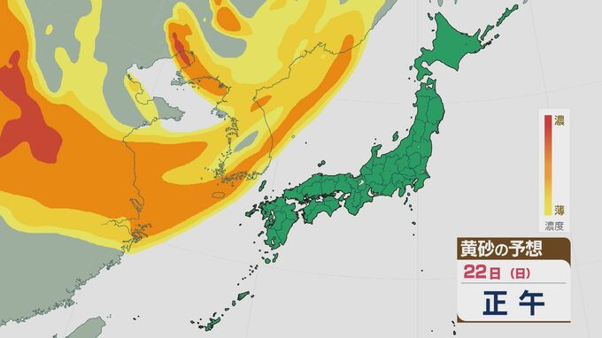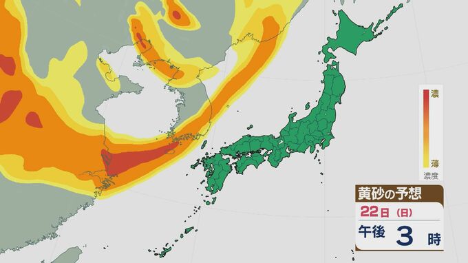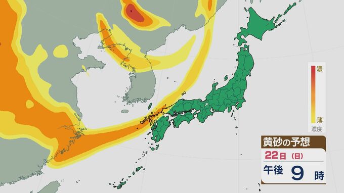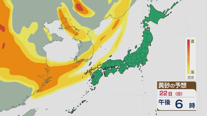 【黄砂情報】大陸からの黄砂が22日(日)から23日(月)にかけて九州や中国・四国に飛来する見込み 最新の飛来予想シミュレーション 北陸放送 2026年2月20日(金) 14:34 国内 22日(日)から23日(月)にかけて、西日本で黄砂が飛来する見込みです。 大陸からの黄砂は22日以降次第に東へと運ばれ、夕方から西日本に達しそうです。22日夜遅くには、九州北部などで濃度が高いところがあるでしょう。