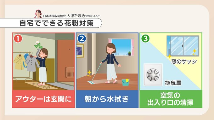 花粉は舞いやすく床に落ちてくるまでに時間がかかるため朝、花粉が床に落ちている間に掃除をしましょう。