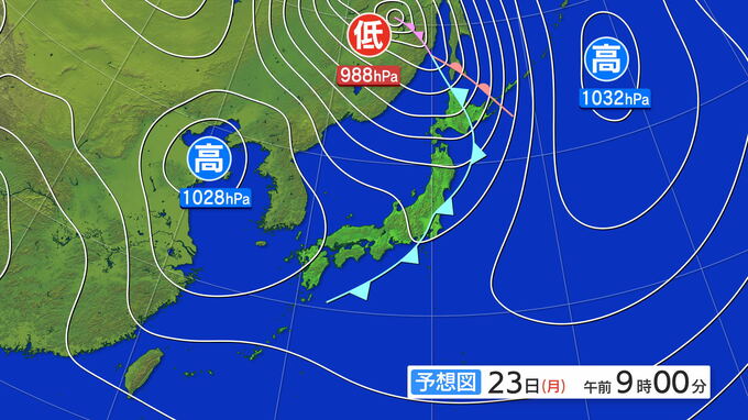 土曜日と日曜日は日本列島は穏やかな天気になりそうです。しかし、週明け23日(月)は大陸の低気圧からのびる寒冷前線が通過する影響で北陸や東北日本海側、北海道などでは雨や雪が強まるところがありそうです。