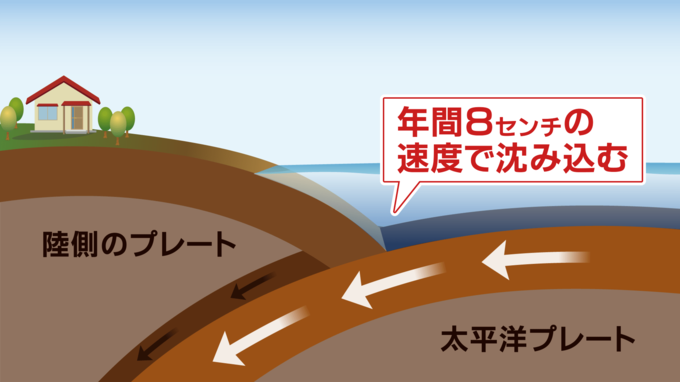 北海道の千島海溝沿いでは、太平洋プレートが年間約8㎝の速度で陸側のプレートの下に沈み込んでいるといいます。