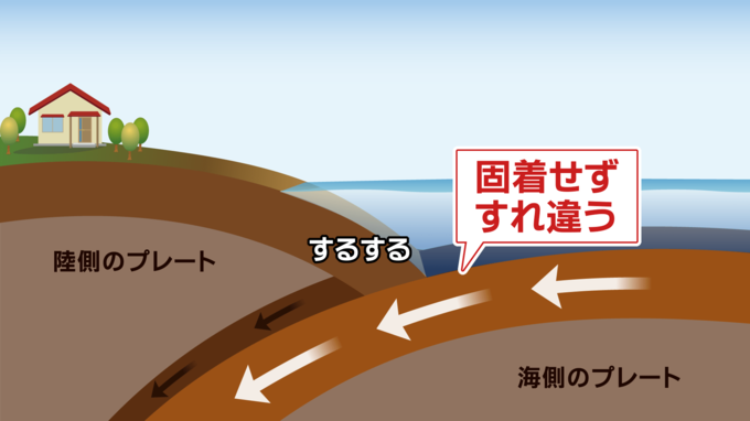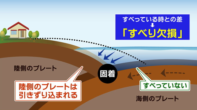 陸側のプレートと海側のプレートの境界で、プレート同士がくっつかずに(=固着せずに)するするとすれ違っている状態に対して、プレート同士が固着して、すべっていない状態、つまり、すれ違わずに陸側のプレートが海側のプレートに引きずり込まれる状態との差を「すべり欠損」と言い、陸側のプレートが長年引きずり込まれ続けると巨大地震の発生につながるとされています。