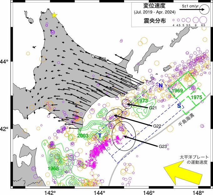 観測の結果を示す図1を見ると、千島海溝に近い陸側のプレート上の観測点(G22)と太平洋プレート上の観測点(G23)は年間約8㎝という速さで西北西方向へ移動していることが判明しました。