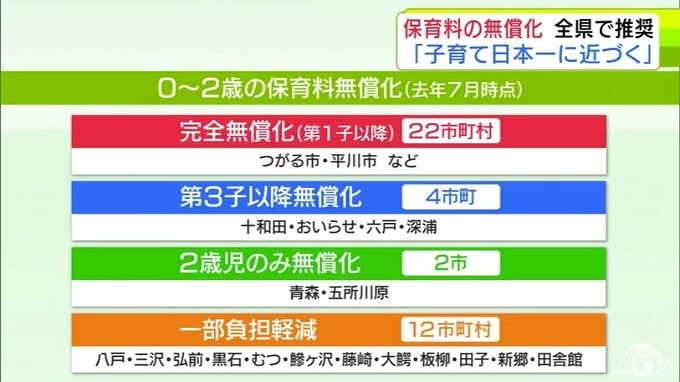 このうち、市町村の交付金には13億9000万円余りをあて、保育料の無償化を推奨しています。県内では2025年7月時点で、0~2歳までの保育料を完全無償化しているのは22市町村でした。