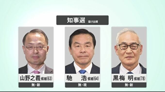 県知事選挙に立候補したのは、届け出順にいずれも無所属で、新人で前金沢市長の山野之義候補(63)、再選をめざす現職の馳浩候補(64)、新人で共産系の団体が擁立した黒梅明候補(78)の3人です。