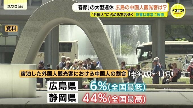 2025年1月~11月にかけて、県内に宿泊した外国人観光客における中国人の割合は広島県が全国最低の6%。全国トップの静岡県の44%と比べると圧倒的な差があります。