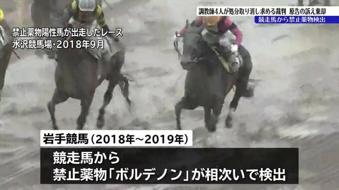 岩手競馬の競走馬から禁止薬物が検出された問題で、県競馬組合による処分の取り消しを求めていた調教師4人の裁判について、盛岡地裁は原告の訴えを棄却する判決を言い渡しました。