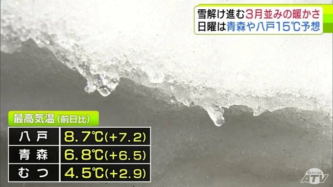 青森県内は20日、多くの所で3月上旬から中旬並みの暖かさとなり、各地の最高気温は八戸8.7℃、青森6.8℃、むつ4.5℃などと、19日より7℃以上高い所もありました。