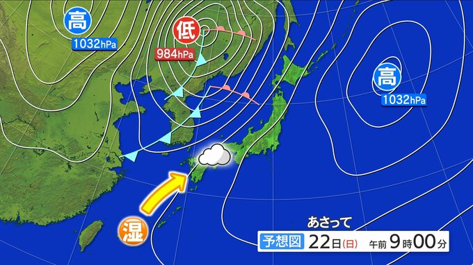 あさって22日(日)は、南からの風に乗って湿った空気が流れ込む見込みです。そのため、雲が広がりやすく、午前中から昼過ぎにかけて、パラッとにわか雨が降る時間がありそうです。日差しが届けば暖かいでしょう。各地で15℃を大きく超えて4月並みの気温となる予想です。また、花粉が本格的に飛び始め、大陸からは黄砂が飛来する見込みです。