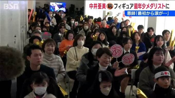 中井亜美選手が小学校の卒業時までトリプルアクセルを練習した新潟市アイスアリーナでは『応援会』が行われ、新潟市内のフィギュアスケートクラブに通う選手や保護者ら50人以上がパブリックビューイングで、見事な着氷に沸き、メダル獲得の瞬間を見守りました。中井選手を指導していた関係者らも感慨ひとしおです。