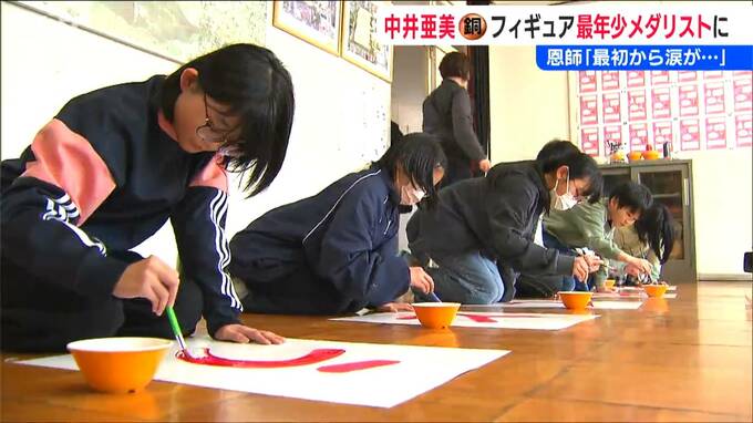 中井亜美選手の母校である、新潟市立女池小学校では早速、子どもたちがメッセージカードを作成。5・6年生およそ20人が、感謝を込めて丁寧に色を塗っています。