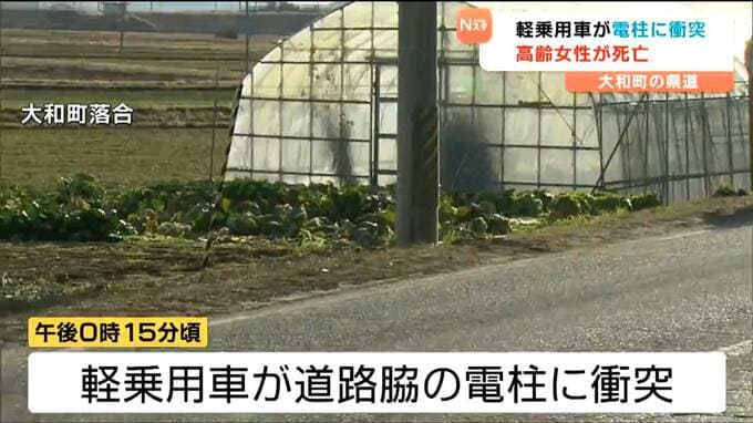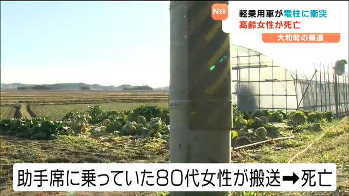 2月20日昼頃、宮城県大和町内の県道で軽乗用車が電柱に衝突し助手席に乗っていた高齢の女性が死亡しました。
