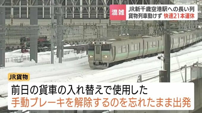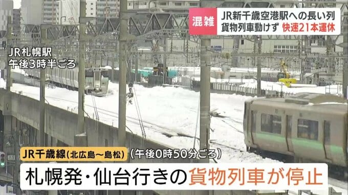 貨物列車は、午後1時半ごろ運転を再開しましたが、この影響で、小樽や札幌と新千歳空港を結ぶ快速エアポート21本が運休しました。