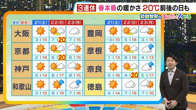 2月21日(土)の近畿地方は、全域で穏やかな晴れ。3月後半並みの暖かさとなり、3連休初日はポカポカ陽気のお出かけ日和になりそうです。 近畿地方は南から高気圧に覆われるでしょう。全域で安定した晴天とな…
