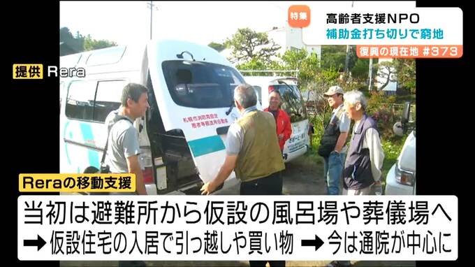 津波で6万台もの車が流されたとされる石巻市。移動手段を失った被災者へのReraの支援は、当初、避難所から仮設の風呂場や葬儀場などへの送迎でした。仮設住宅の入居が進み始めると、引っ越しや買い物などがメインとなり、今は通院が中心に。