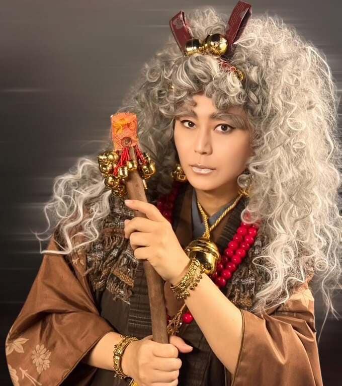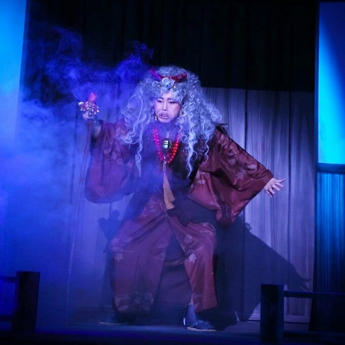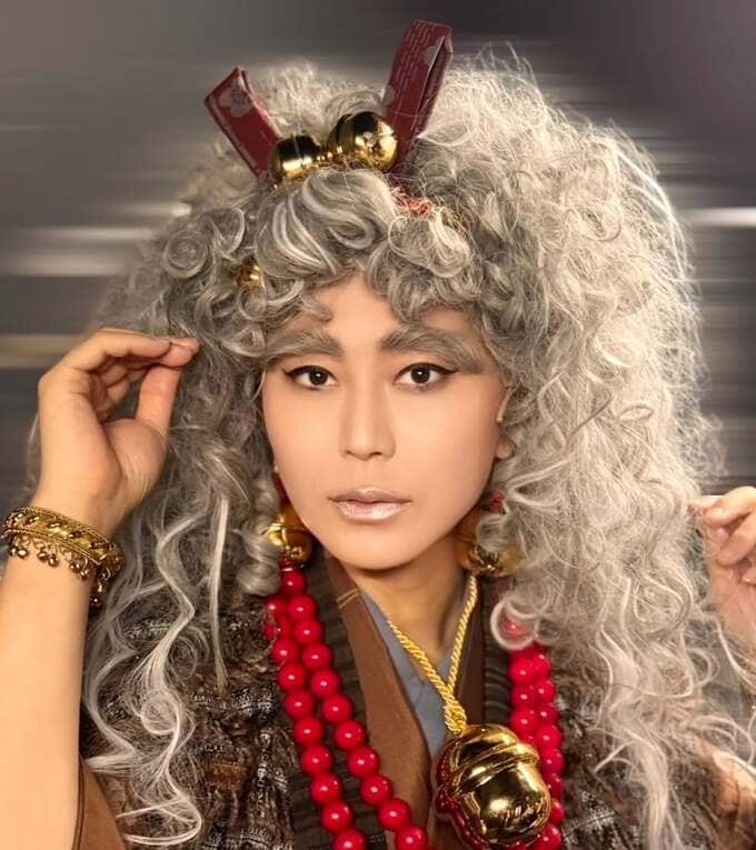 〝深山天女〟とは、獅子のたてがみのような銀髪を波打たせ、数珠や鈴、錫杖などを携えて舞台上を闊歩する迫力の登場人物。氷川さん自身も「ご紹介が遅くなりました。妖怪ではありませぬ」と投稿するほどの異彩を放っています。
