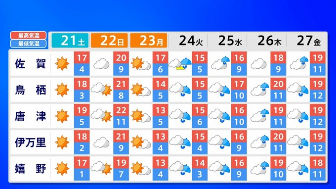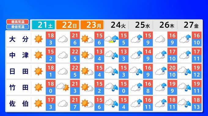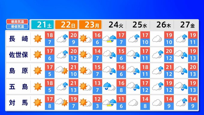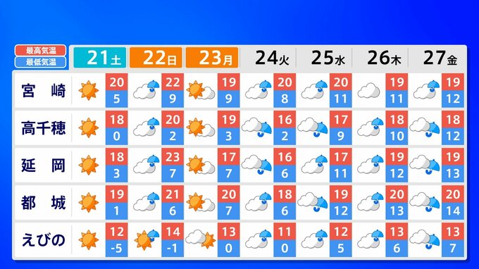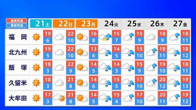 【九州 日曜は春一番か?】3連休明け「雨の日続く」水不足解消なるか?【雨のシミュレーション21日(土)~25日(水) /九州各都市の週間予報(3連休天気)】福岡・佐賀・長崎・大分・熊本・宮崎・鹿児島 南日本放送 2026年2月20日(金) 21:00 国内 天気 九州地方 各都市の週間予報(21日(土)~ 27日(金)) 週間予報を画像で掲載しています(各都県5か所ずつ)。福岡県の場合、福岡市・北九州市・飯塚市・久留米市・大牟田市です。 3連休明けは雨の日が続きそうです、画像で確認できます。 この記事をはじめから → 【九州 日曜は春一番か?】3連休明け雨の日続く「雨シミュレーション」