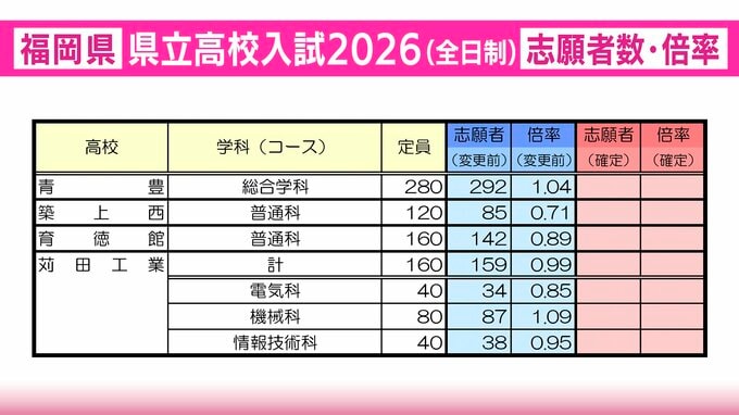 【全校掲載】福岡県立高校(北九州地区) 2026年一般入試の志願者数・倍率 東筑1.35倍・小倉1.20倍・八幡0.98倍・戸畑1.20倍 RKB毎日放送 2026年2月20日(金) 21:31 国内 青豊・築上西・育徳館・苅田工業の志願者数と倍率