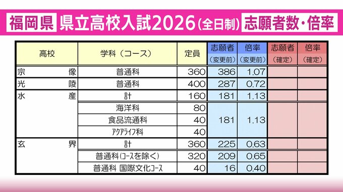 【全校掲載】福岡県立高校(福岡地区) 2026年一般入試の志願者数・倍率 修猷館1.73倍・福岡1.48倍・筑紫丘1.50倍・城南1.48倍 RKB毎日放送 2026年2月20日(金) 21:31 国内 宗像・光陵・水産・玄界の志願者数と倍率