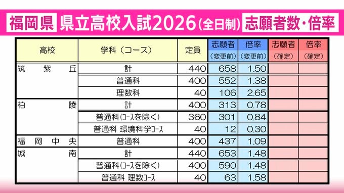 【全校掲載】福岡県立高校(福岡地区) 2026年一般入試の志願者数・倍率 修猷館1.73倍・福岡1.48倍・筑紫丘1.50倍・城南1.48倍 RKB毎日放送 2026年2月20日(金) 21:31 国内 筑紫丘・柏陵・福岡中央・城南の志願者数と倍率