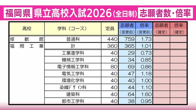 【全校掲載】福岡県立高校(福岡地区) 2026年一般入試の志願者数・倍率 修猷館1.73倍・福岡1.48倍・筑紫丘1.50倍・城南1.48倍 RKB毎日放送 2026年2月20日(金) 21:31 国内 修猷館・福岡工業の志願者数と倍率