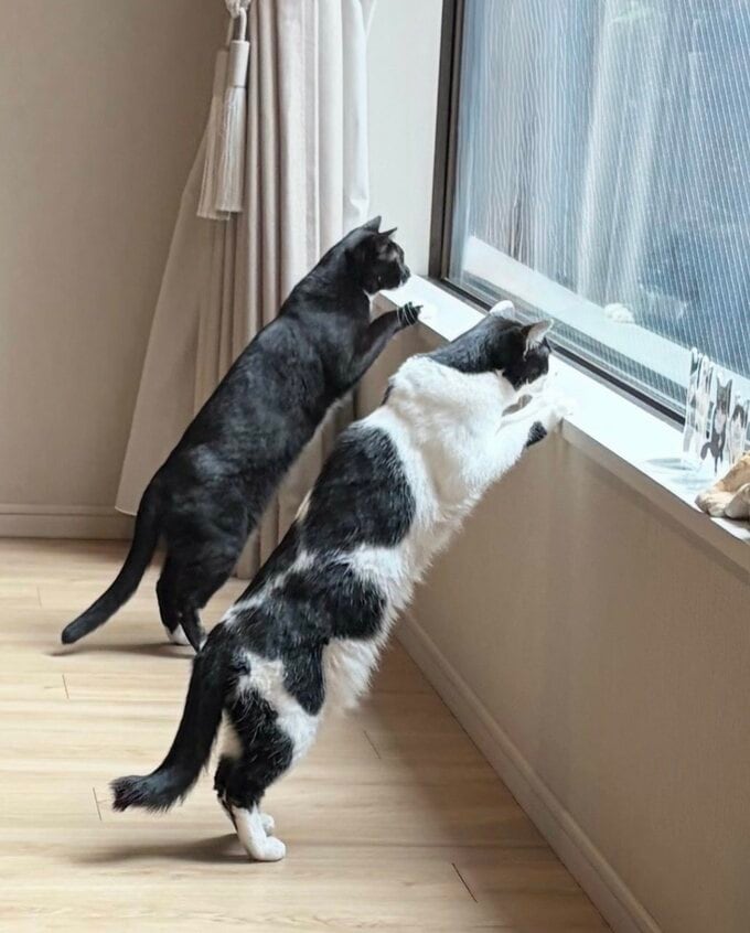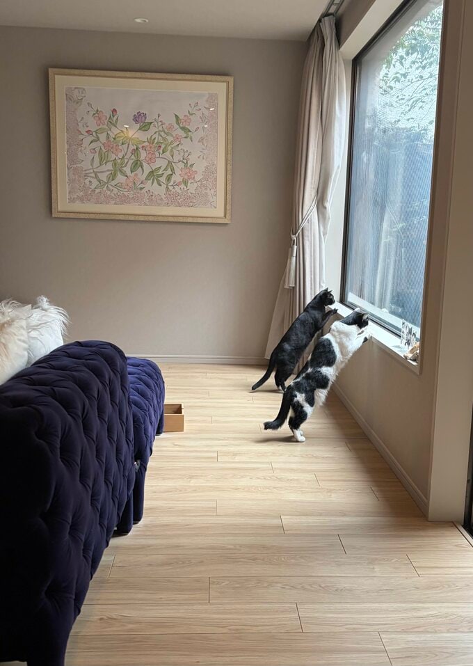「本気出してた」の言葉通り、窓枠に前足を掛け、まるで監視をするかの様に外を覗いている、マルとオレオのかわいらしい様子を見ることができます。