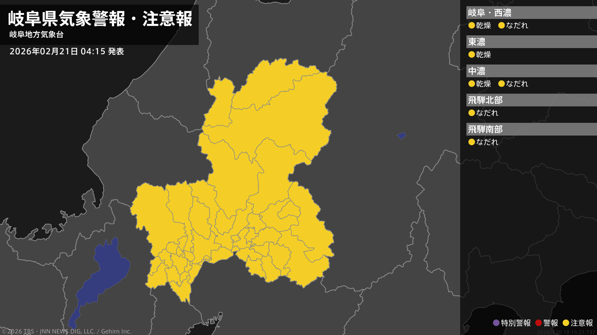気象台は、午前4時15分に、なだれ注意報を高山市、飛騨市、郡上市、下呂市、揖斐川町、白川村に発表しました。