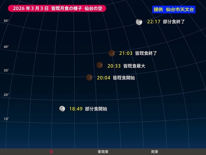 3月3日(火)の夜に、満月が地球の陰に隠れて赤黒くなる皆既月食が全国で見られます。国内で皆既月食が見られるのは2025年9月8日以来半年ぶりです。仙台市天文台では、今回の月食を非常に見やすい好条件の天体ショーだとおすすめしています。