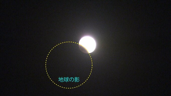 仙台市天文台 迫千紘さん「月食は地球の影に月が入っていく現象ですので、月が欠けていく部分、そこに地球の影があります。さらに影の縁に沿って丸をつくってあげると、地球の影の大きさをだいたい見積もることができます。空で見ますと、月が3個並ぶくらいの大きさですので、ぜひそこにも注目してください」
