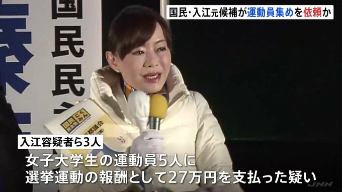 今月の衆議院選挙で、国民民主党から立候補した入江伸子容疑者(63)らが運動員に報酬を支払ったとして逮捕された事件で、入江容疑者本人が陣営のSNS運用を担当する女に運動員集めを依頼していたことがわかりまし…