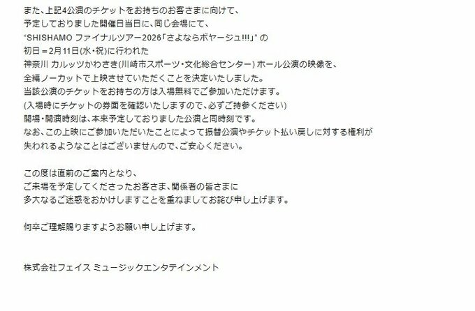 さらに、「上記4公演のチケットをお持ちのお客さまに向けて、予定しておりました開催日当日に、同じ会場にて」「“SHISHAMO ファイナルツアー2026「さよならボヤージュ!!!」” の初日=2月11日(水・祝)に行われた 神奈川 カルッツかわさき(川崎市スポーツ・文化総合センター) ホール公演の映像を」「全編ノーカットで上映させていただくことを決定いたしました」と発表。