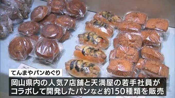 岡山県内の人気の7店舗と天満屋各フロアの若手社員が共同開発したオリジナルパン11種類を含む約150種類が販売されています。