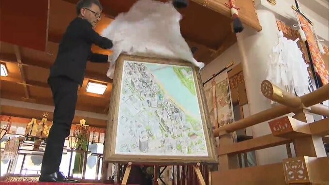 奉納された鳥瞰図には街並みが立体的に描かれ、岡山神社恒例の「蚤の市」の賑わいも細密に描き込まれています。