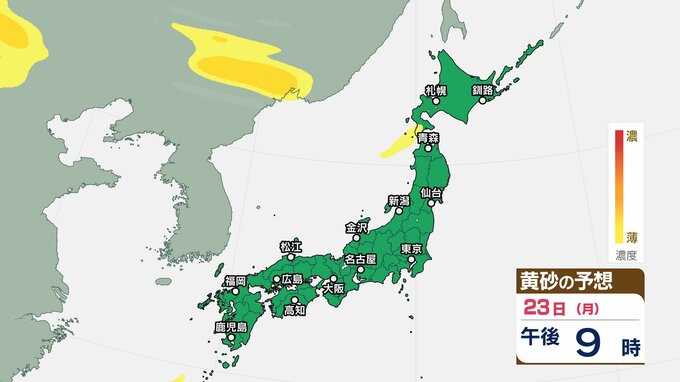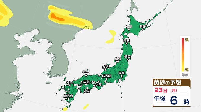 西日本を中心に黄砂が最も飛来するのは、23日(月)午前0時から午後6時の間です。エリアでは、洗濯物などを屋外で干す際は注意が必要です。また目、鼻、皮膚などに関するアレルギー体質の方や、喘息など呼吸器に疾患がある方は、十分に注意してください。