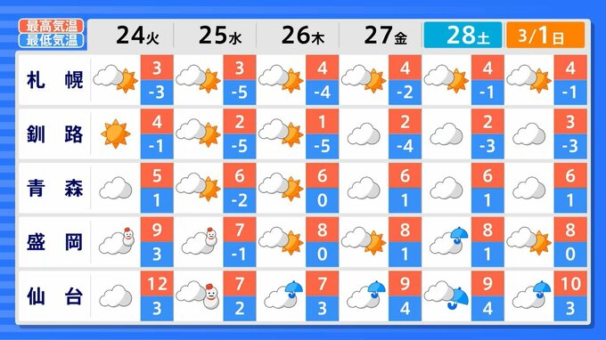 東北地方の向こう2週間の気温は、暖かい空気に覆われやすいため高い日が多く、2月21日頃からはかなり高くなる見込みです。