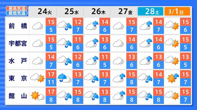 関東甲信地方の向こう2週間の気温は、暖かい空気に覆われやすいため高い日が多く、2月22日頃からはかなり高くなる見込みです。