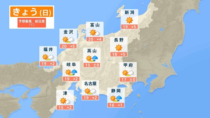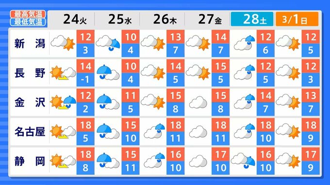 東海・北陸・甲信地方の週間予報