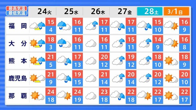 九州北部地方(山口県を含む)の向こう2週間の気温は、暖かい空気に覆われやすいため高い日が多く、2月22日頃と25日頃からはかなり高くなる見込みです。