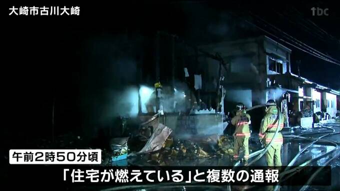 22日午前2時50分頃、大崎市古川大崎で、「住宅が燃えている」と消防に複数の通報がありました。消防がポンプ車など9台で消火にあたり、火はおよそ3時間後に消し止められました。警察によりますと、この火事で木造2階建ての店舗兼住宅と倉庫が全焼したということです。