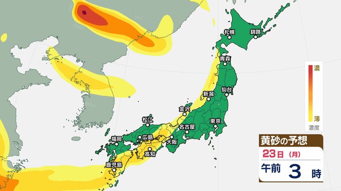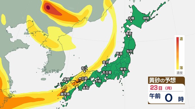【黄砂情報】黄砂があす日本列島に飛来か 九州、中国、四国など西日本の広い範囲で影響の可能性 【気象庁黄砂シミュレーション/22日更新】 RSK山陽放送 2026年2月22日(日) 13:56 国内 天気 23日(月)午前 黄砂シミュレーション