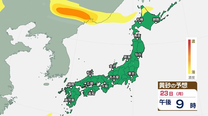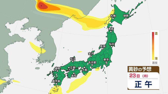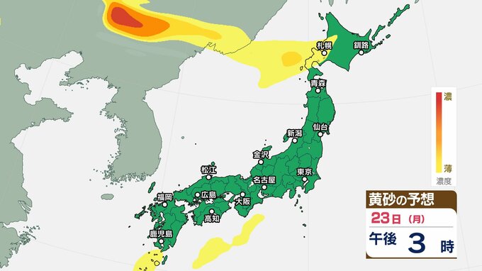 西日本を中心に黄砂が最も飛来するのは、あす(23日)午前0時から午後6時の間です。