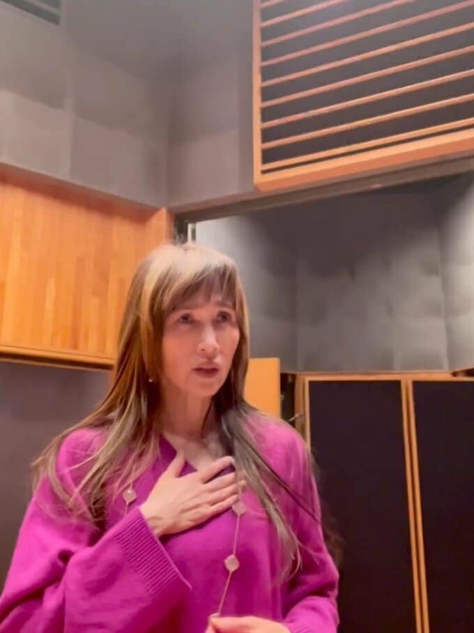 動画では、紫色のセーターを着た工藤さんが木目パネルと音響パネルに囲まれたスタジオで、指導者から発声に関するアドバイスを受けています。「いつまででもできるようなところでやりたい」「上がるけれども、また上からちゃんと下ろしながらその音をいく」といった具体的な発声指導の様子が収められています。
