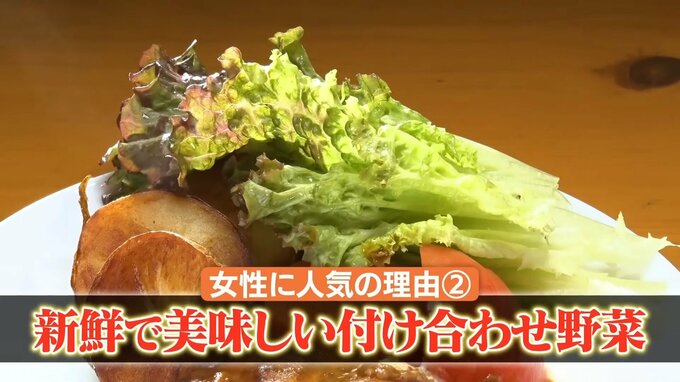 ハンバーグだけでなく、付け合わせの野菜も女性から大人気!レタスにトマト、にんじん、ジャガイモとシンプルながらどれもゴロッと大きく、食べ応えも十分。