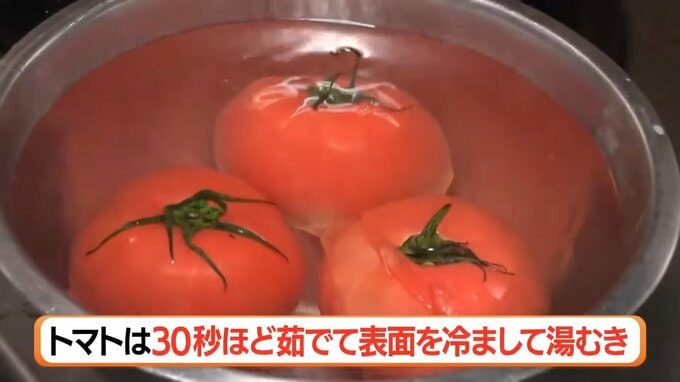 中身を傷つけず、苦味や渋みの元となる皮を湯むきすることで、トマト本来の甘さがダイレクトに感じやすくなるんだとか。