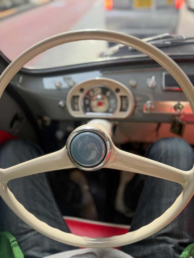 千原ジュニアさんは「今日の車内」というコメントを添えて、ベージュ色の円形ステアリングを中心とした車内の写真を投稿しています。ダッシュボードには丸型の計器パネルが配置され、クラシックなデザインが特徴的です。座席は赤いレザーシートで、千原ジュニアさんの黒いジーンズの膝元が写り込んでいます。