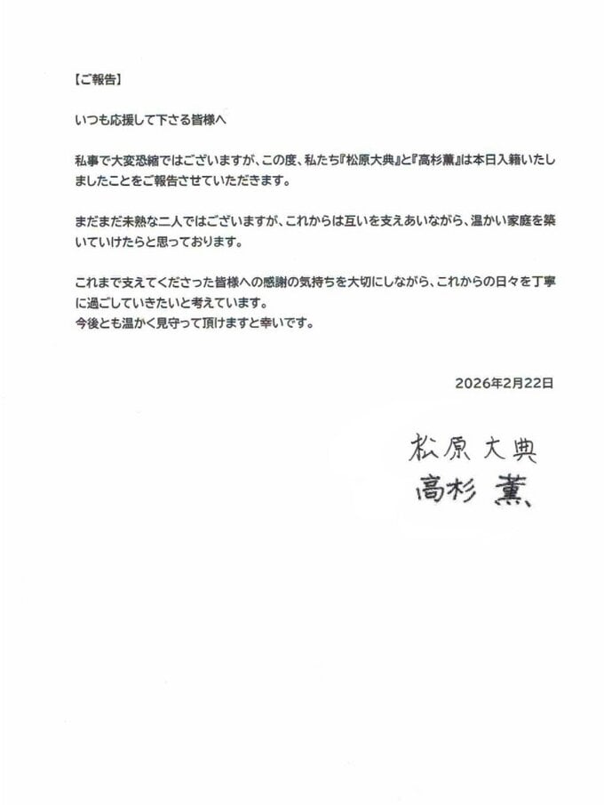 Xでは、松原大典さんと高杉薫さんの直筆の署名を添えて「私事で大変恐縮ではございますが、この度、私たち『松原大典』と『高杉薫』は本日入籍いたしましたことをご報告させていただきます。」と、報告。