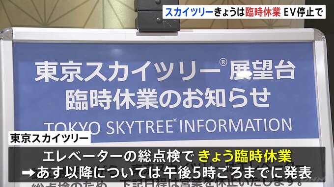 東京スカイツリーはきのう夜、エレベーターが緊急停止したことを受け、きょう(23日)は総点検を行うため臨時休業すると発表しました。きのう午後8時20分ごろ、東京・墨田区の東京スカイツリーで、エレベーター1台…