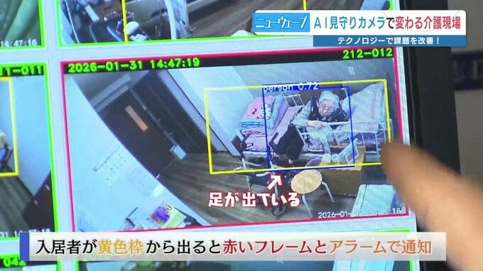 肝は、AIによる人物の認識と、自由に設定できる黄色のエリア、夜はベッドに合わせてエリアを設定し、入居者がその枠を越えようとすると、色と音で通知します。