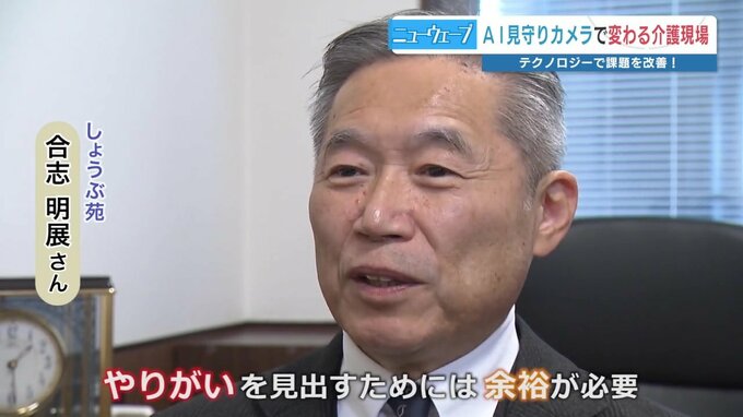 しょうぶ苑 合志明展さん「初めて取り組む人も、介護を続けられるぞという風なやりがいを見出してほしいんですね。やりがいを見出すためにはやっぱり余裕が必要。このカメラを導入して少しの余裕ができ『介護をやっていてよかったな』と思ってもらいたい」
