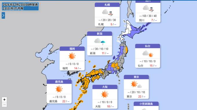日本付近には平年より10℃から15℃前後も高い暖気が流れ込んでいます。 東京で22℃、大阪・名古屋で18℃、鹿児島では22℃などが予想されており、5月並みの暑さになる所がある予想です。