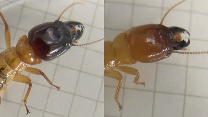 通常のオオシロアリは、頭全体が「濃い赤茶色」ですが、高知で見つかったオオシロアリは「頭の後ろが薄い黄茶色」でした。さらに、頭部に対しての大あごの大きさも、通常のオオシロアリに比べて小さかったということです。